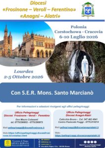 Pellegrinaggio in Polonia 27 – 30 settembre 2019 Cracovia, Auschwitz e Wieliczka Dettagli nelle due locandine di seguito Polonia_Pellegrinaggio_27_30_settembre.pdf Condizioni_Pellegrinaggio_Polonia.pdf Per informazioni 0775.290852 pellegrinaggi@diocesifrosinone.it Pellegrinaggio diocesano in Terra Santa – luglio 2019 presieduto dal Vescovo Ambrogio Programma Programma_Terra_Santa_FR_last.pdf Locandina Terra_santa_2019.jpg Per informazioni 0775.290852 – pellegrinaggi@diocesifrosinone.it Qui la locandina […]